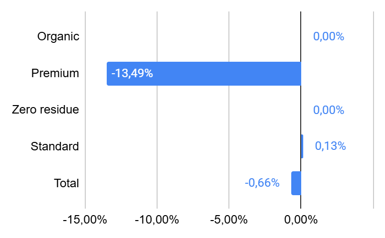 - 14% of the SKU's showed decreased prices, with prices down by 19% compared to the previous week.