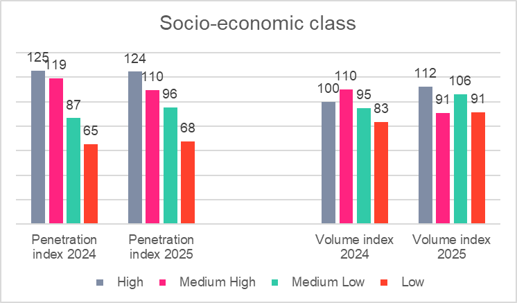 Socio-economic class: penetration remains selective, but volumes are rebalancing
