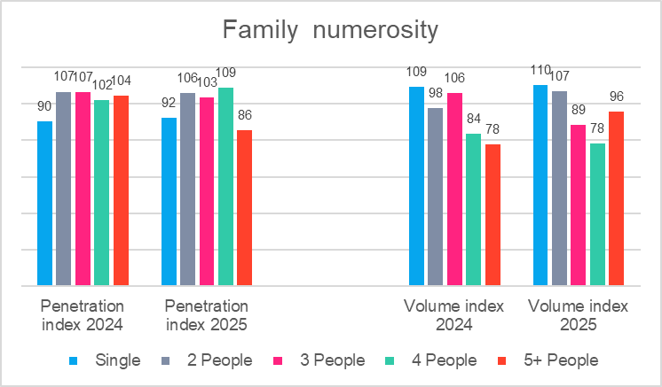 As for household size, there is no simple linear relationship between number of members and consumption. 2025 data instead suggest a segmentation of behaviors: