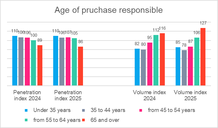 The clearest case is the 65+ segment, with a volume index of 127, up sharply from 116 in 2024. It is the highest value among all age segments analyzed.
