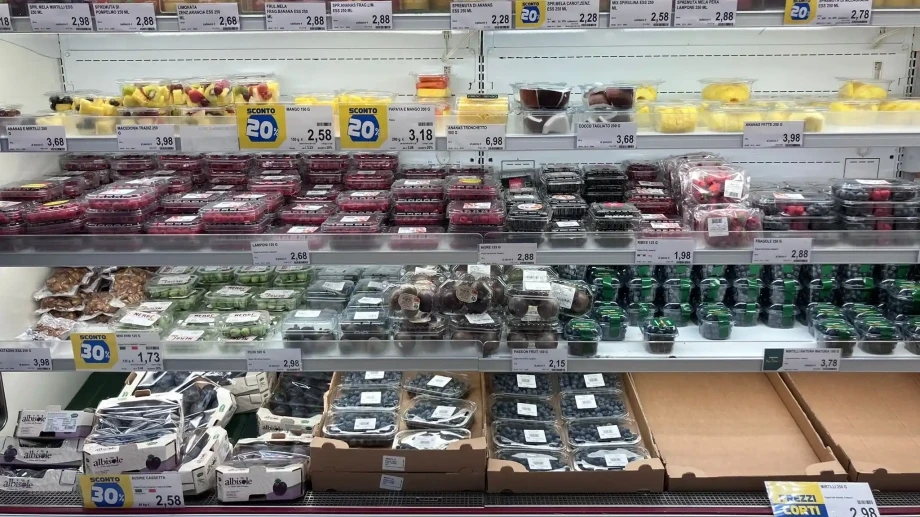 Few brands, very strong and well alternated. Regarding blueberries, the presence of larger formats confirms the greater product availability: 500-gram packs are very common, with prices even below 10 euros/kg.