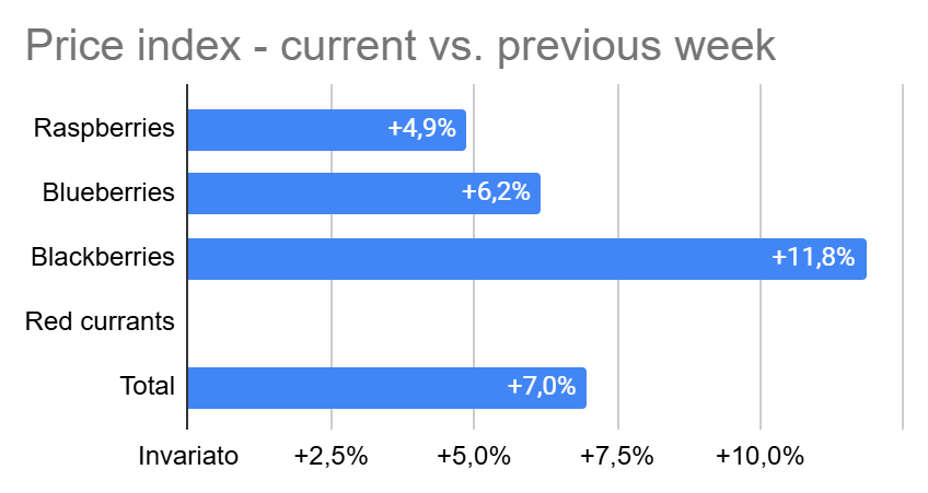 Italian retail prices in the berry category have shown the following variations in week 39/2025 compared to the previous week: