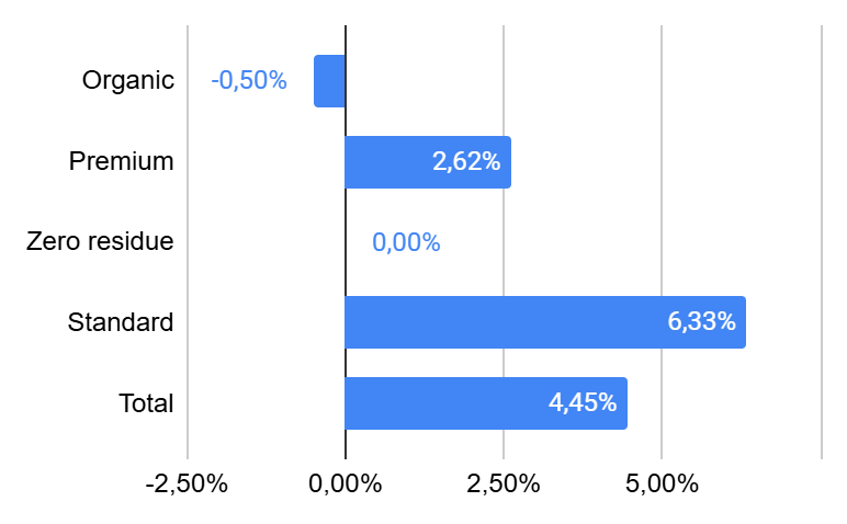 - 4% of the SKU's showed decreased prices, with prices down by 7% compared to the previous week.