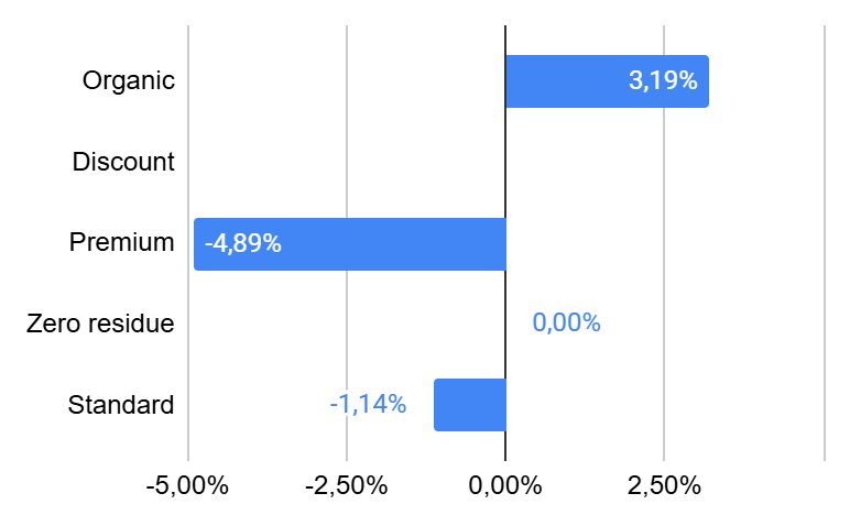 - 16% of the SKU's showed decreased prices, with prices down by 14% compared to the previous week.