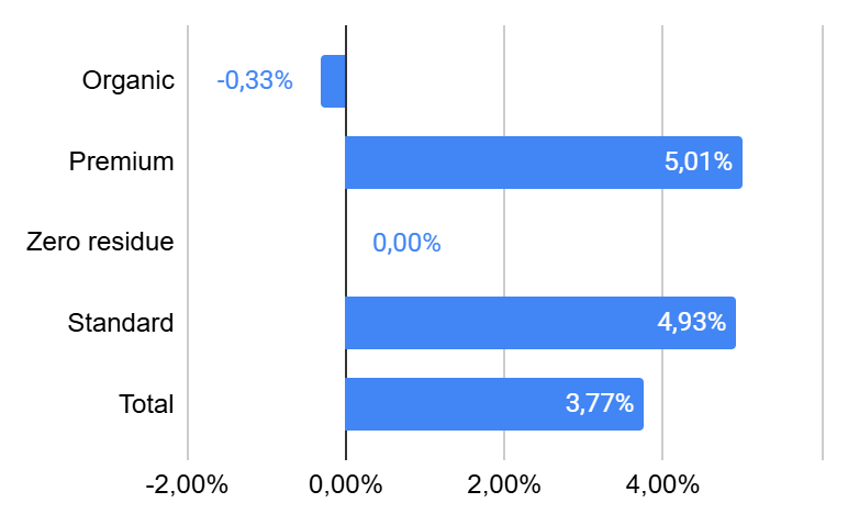 - 17% of the SKU's showed increased prices, with prices up by 27% compared to the previous week;