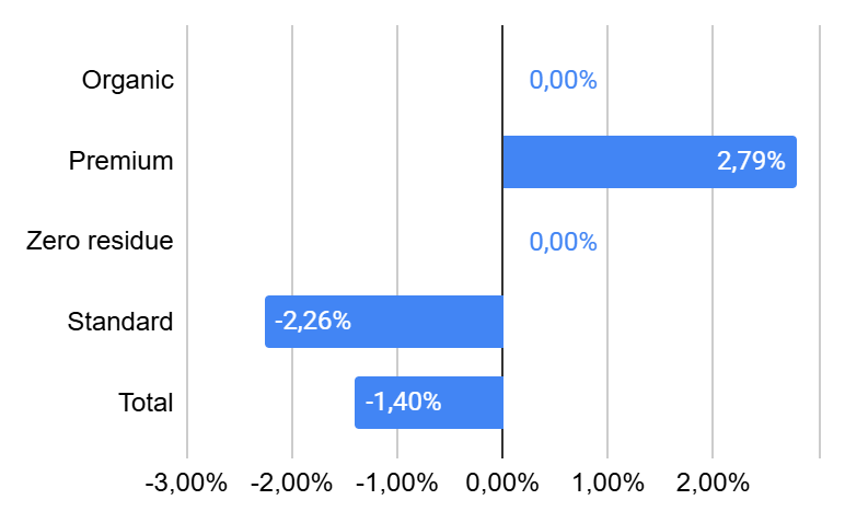 - 12% of the SKU's showed decreased prices, with prices down by 21% compared to the previous week.