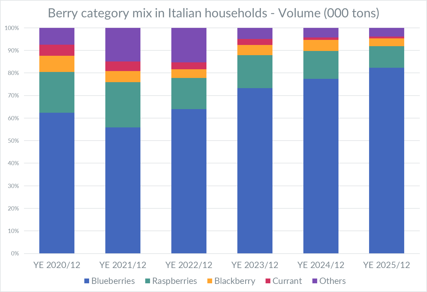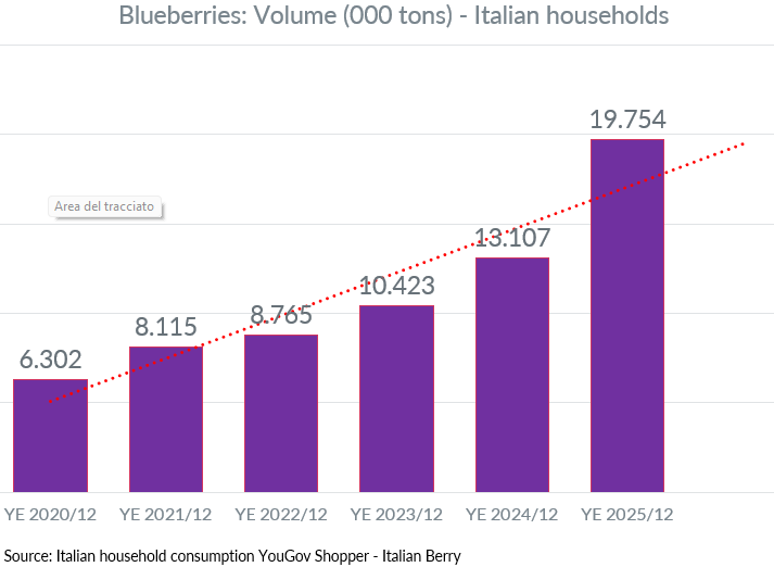 This increase fits into a multi-year trend: over the past six years, Italian households have more than tripled blueberry purchases in volume.