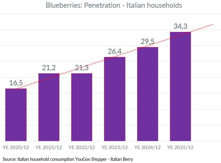 A significant target now appears closer—already reached and surpassed in several major international markets (including the UK, the United States and Poland): the 50% threshold, with blueberries entering one home out of two.