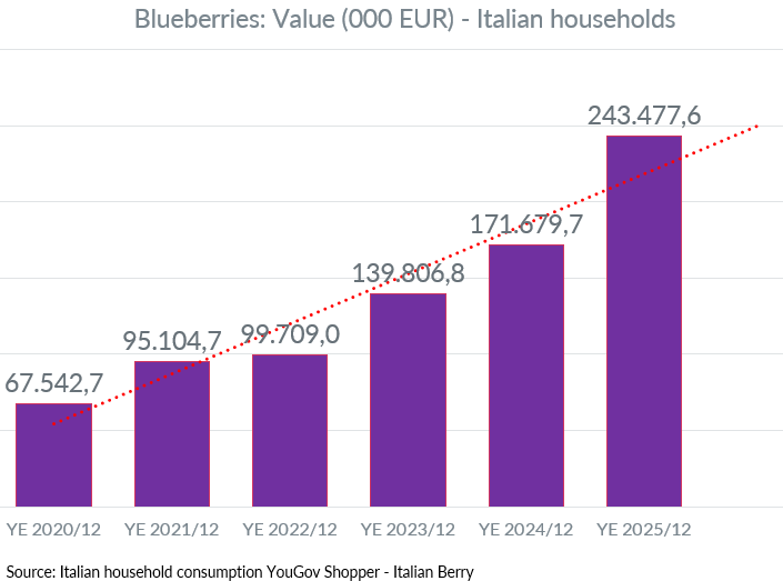 In 2025, Italian household spending on blueberries alone exceeded total spending for all berries in 2024 (€239 million).