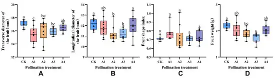Figure 1. Effects of different pollination treatments on blueberry fruit size; different lowercase letters indicate significant differences among treatments (p < 0.05). (A) Analysis of fruit transverse diameter under different pollination treatments. (B) Analysis of fruit longitudinal diameter. (C) Analysis of fruit shape index. (D) Analysis of single fruit weight.