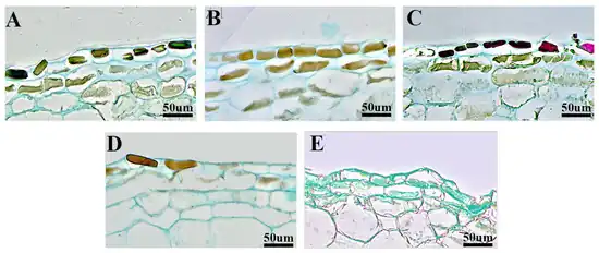 Figure 2. Observation of epidermal cells under different pollination treatments; (A–E) show epidermal cells treated with CK, A1, A2, A3, and A4, respectively. Images were taken at 100× magnification.