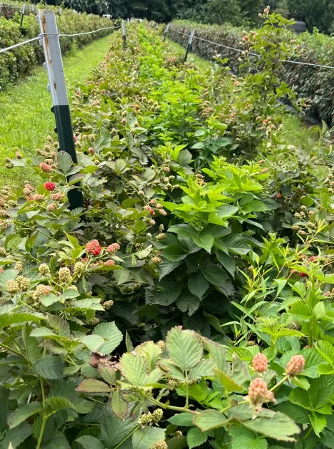 Fruit in early stages of ripening with primocanes beginning to grow through the canopy. 18 June 2025. Photo credit: Carmen Johns UADA Research Scientist, Assistant Fruit Breeder.