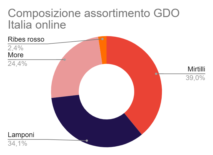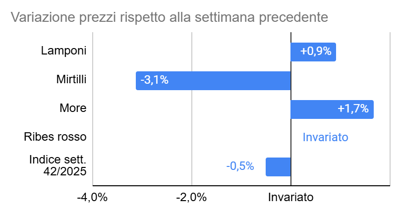 In sintesi i prezzi dei piccoli frutti nella GDO italiana nella settimana 42/2025 hanno avuto il seguente andamento rispetto alla settimana precedente: