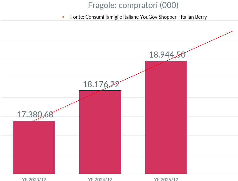 Le famiglie acquirenti di fragole aumentano da 18,176 milioni nel 2024 a 18,945 milioni nel 2025, con una variazione di 768 mila famiglie e del +4,2%. Anche qui il percorso è positivo lungo tutta la serie disponibile: 17,381 milioni nel 2023, 18,176 milioni nel 2024 e 18,945 milioni nel 2025. Il dato segnala una crescita strutturale della base acquirente, che rappresenta uno dei principali punti di forza della categoria.