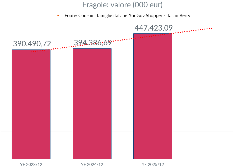 Il valore complessivo del mercato delle fragole sale da 394,387 milioni di euro nel 2024 a 447,423 milioni nel 2025, con un incremento di 53,036 milioni di euro e del +13,4%. Anche rispetto al 2023, quando il valore era pari a 390,491 milioni, il progresso è evidente. Si tratta di un KPI in crescita strutturale, con un’accelerazione molto forte nell’ultimo anno.