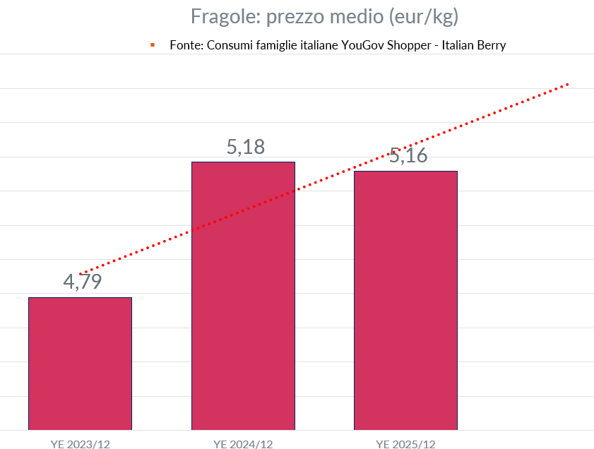 La lettura economica è molto chiara: nel 2025 il valore del mercato delle fragole cresce soprattutto per effetto dell’aumento dei volumi e della crescita della base acquirente, più che per effetto del prezzo medio, che anzi risulta sostanzialmente stabile o in lieve calo. È un segnale molto sano per la filiera, perché indica uno sviluppo fondato sulla domanda reale e non solo sulla rivalutazione del prezzo unitario.