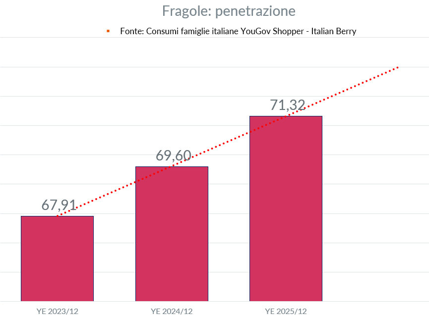 La penetrazione sale dal 69,60% del 2024 al 71,32% del 2025, con un incremento di 1,72 punti e del +2,5%. Anche in questo caso la dinamica è progressiva: 67,91% nel 2023, 69,60% nel 2024, 71,32% nel 2025. Le fragole raggiungono quindi oltre sette famiglie su dieci, confermandosi una categoria a larghissima diffusione all’interno dei piccoli frutti.