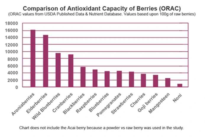 L’aronia si distingue per valori ORAC (capacità antiossidante) largamente superiori a quelli di mirtillo, goji e acai, seconda soltanto al maqui tra i superfrutti diffusi, con una concentrazione di antociani, polifenoli e proantocianidine doppi o anche multipli rispetto agli altri principali competitor.