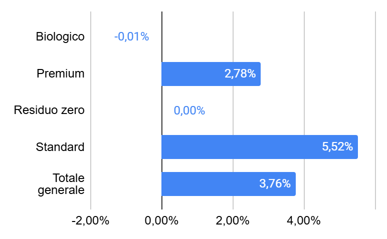 L'assortimento del paniere di questa settimana conta 50 referenze in 14 insegne globali della GDO, con una media di 3,6 referenze per insegna. La settimana precedente erano state rilevate 52 referenze in 14 insegne (media 3,7 referenze per insegna). Il numero complessivo di referenze è quindi diminuito del 4% rispetto alla settimana precedente.