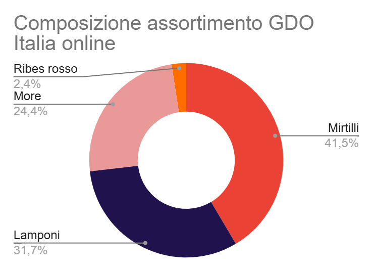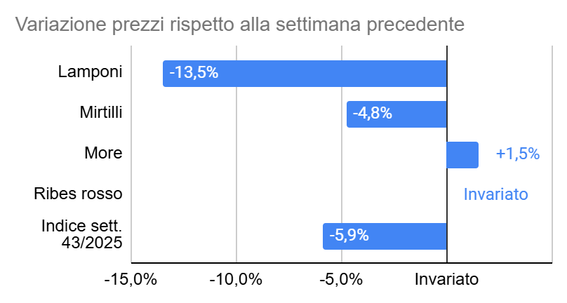 In sintesi i prezzi dei piccoli frutti nella GDO italiana nella settimana 43/2025 hanno avuto il seguente andamento rispetto alla settimana precedente: