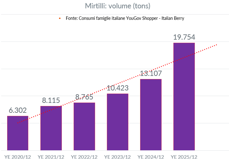 Il 2025 ha registrato una straordinaria accelerazione nei consumi di mirtilli delle famiglie italiane, che hanno sfiorato le 20.000 tonnellate e i 250 milioni di spesa complessiva.