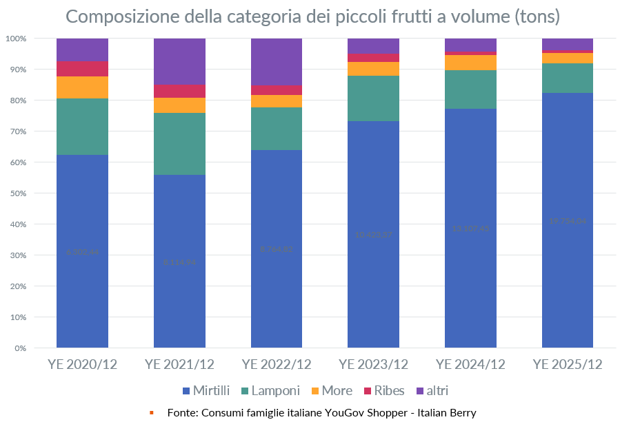 I mirtilli stanno anche aumentando regolarmente la loro importanza all'interno della categoria dei piccoli frutti: mentre fino a pochi anni era attorno al 60%, nel 2025 la quota a volume ha superato il'80% mentre quella a valore si attesta al 75%.