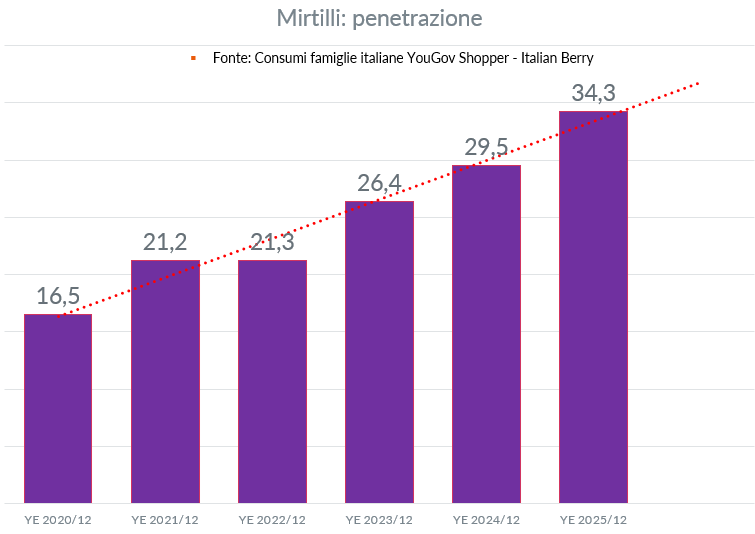 Uno dei principali indicatori che spiegano gli incrementi registrati nel consumo di mirtilli è la penetrazione, più che raddoppiata tra 2020 e 2025.