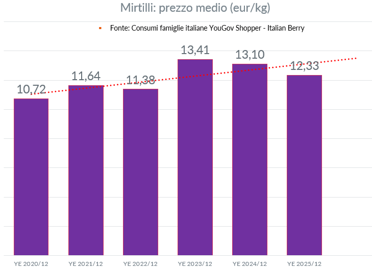 Si tratta di un'aumento che si inserisce in un trend pluriennale, in base al quale negli ultimi 6 anni le famiglie italiane hanno più che triplicato gli acquisti di mirtilli a volume.