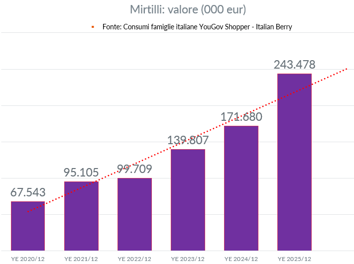 Nel 2025 la spesa delle famiglie italiane per i soli mirtilli ha superato la spesa per tutti i piccoli frutti del 2024 (Eur 239 milioni).