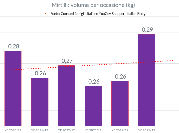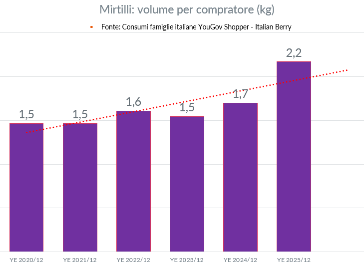 I mirtilli stanno consolidando il loro posto nelle abitudini di acquisto delle famiglie italiane. È un trend che si conferma ogni anno secondo i dati di YouGov Shopper - Italian Berry, e i dati aggiornati al 31/12/2025 descrivono in modo approfondito i principali fattori che determinano questo trend crescente.