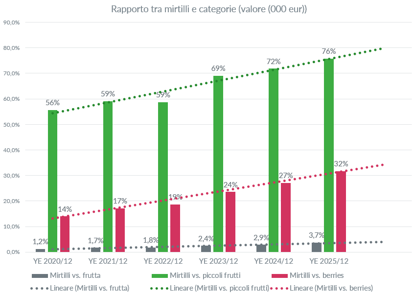 Non è trascurabile nemmeno la quota che detengono i mirtilli sulla spesa totale del carrello frutta, giunta nel 2025 a quota 3,7%.