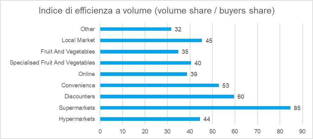Il supermercato si conferma il canale più efficiente nel tradurre la presenza degli acquirenti in acquisti. Al secondo posto il canale convenience; in una fascia media di efficienza si trovano discount e ipermercati, mentre nelle posizioni più basse ci sono l’e-commerce e il dettaglio specializzato. Questi ultimi attraggono pochi consumatori, i quali acquistano anche relativamente meno che negli altri canali.