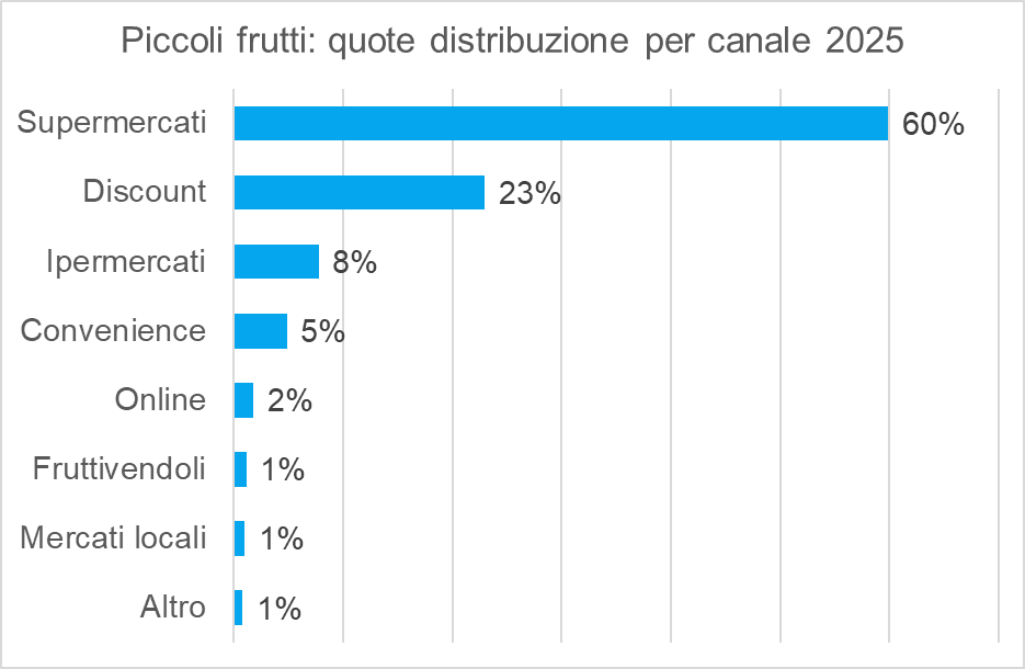 Contemporaneamente arretrano canali specializzati e tradizionali. I piccoli frutti sono sempre più una categoria “da spesa ordinaria” (supermercati/discount) mentre non si affermano ancora come categoria “da acquisto specialistico” o “di prossimità”. Questo influenza la competizione: assortimento, continuità, promozioni e gestione scaffale diventano ancora più determinanti.