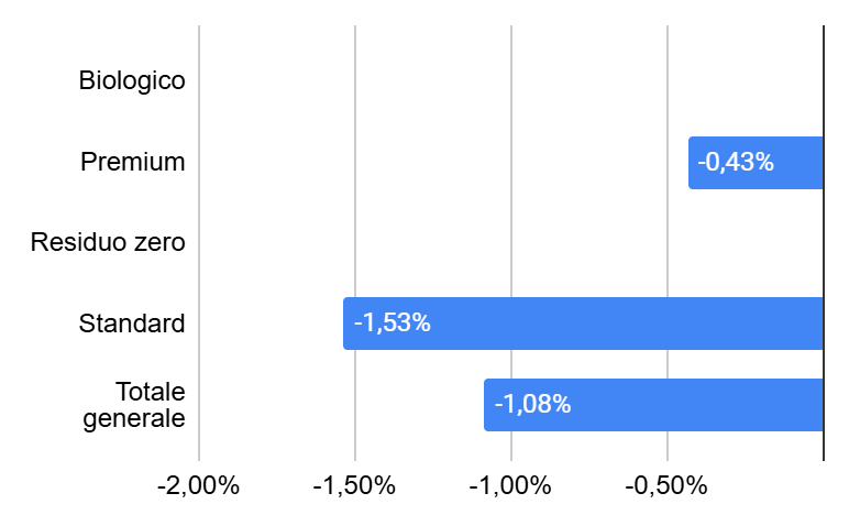 - Sul 17% delle referenze sono stati rilevati prezzi in diminuzione, con prezzi diminuiti del 17% rispetto alla settimana precedente.