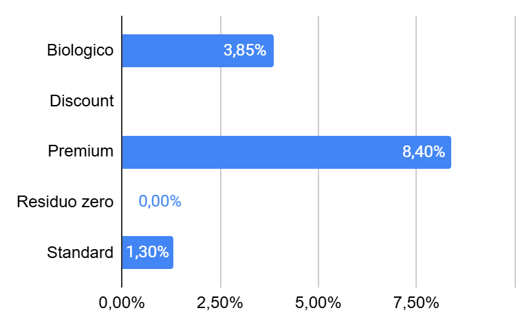 L'assortimento del paniere di questa settimana conta 47 referenze in 14 insegne globali della GDO, con una media di 3,4 referenze per insegna. La settimana precedente erano state rilevate 43 referenze in 14 insegne (media 3,1 referenze per insegna). Il numero complessivo di referenze è quindi aumentato del 9% rispetto alla settimana precedente.
