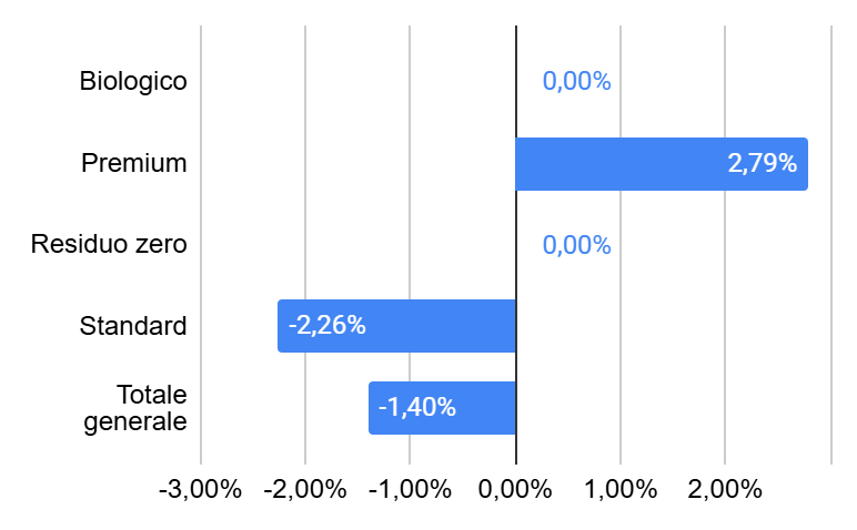 L'assortimento del paniere di questa settimana conta 51 referenze in 14 insegne globali della GDO, con una media di 3,6 referenze per insegna. La settimana precedente erano state rilevate 52 referenze in 14 insegne (media 3,7 referenze per insegna). Il numero complessivo di referenze è quindi diminuito del 2% rispetto alla settimana precedente.