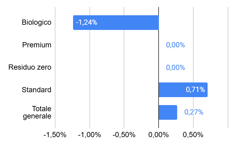 - Sul 4% delle referenze sono stati rilevati prezzi in aumento, con prezzi aumentati del 33% rispetto alla settimana precedente;