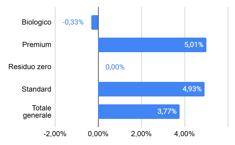- Sul 2% delle referenze sono stati rilevati prezzi in diminuzione, con prezzi diminuiti del 4% rispetto alla settimana precedente.