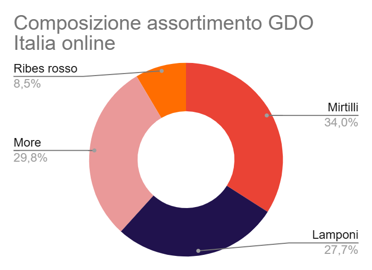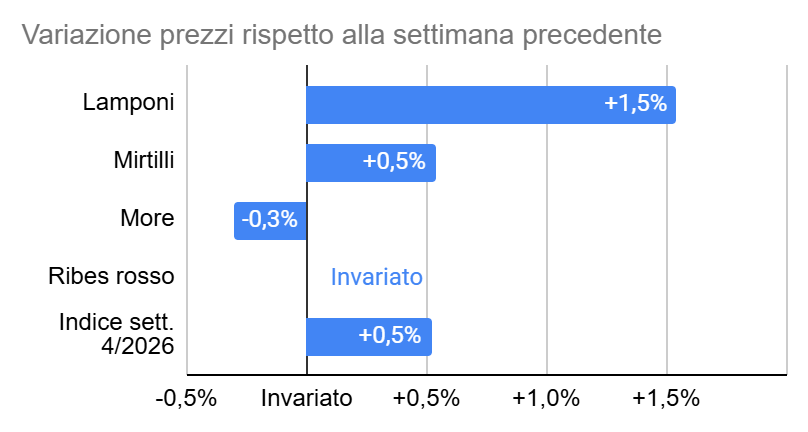 In sintesi i prezzi dei piccoli frutti nella GDO italiana nella settimana 4/2026 hanno avuto il seguente andamento rispetto alla settimana precedente: