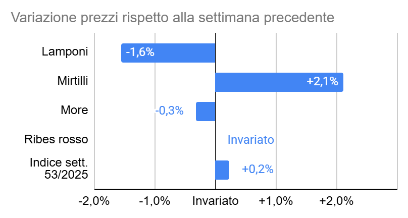 In sintesi i prezzi dei piccoli frutti nella GDO italiana nella settimana 01/2026 hanno avuto il seguente andamento rispetto alla settimana precedente: