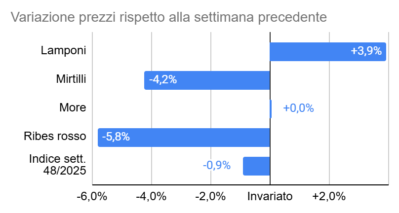 In sintesi i prezzi dei piccoli frutti nella GDO italiana nella settimana 48/2025 hanno avuto il seguente andamento rispetto alla settimana precedente: