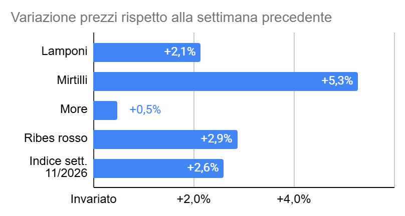 In sintesi i prezzi dei piccoli frutti nella GDO italiana nella settimana 11/2026 hanno avuto il seguente andamento rispetto alla settimana precedente: