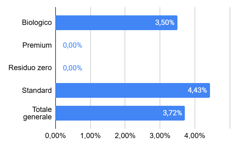 L'assortimento del paniere di questa settimana conta 46 referenze in 13 insegne globali della GDO, con una media di 3,5 referenze per insegna. La settimana precedente erano state rilevate 51 referenze in 14 insegne (media 3,6 referenze per insegna). Il numero complessivo di referenze è quindi diminuito del 10% rispetto alla settimana precedente.