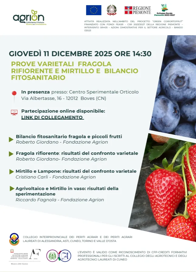 Un pomeriggio di approfondimento tecnico su fragola rifiorente, mirtillo, lampone e agrivoltaico: è quanto propone la Fondazione Agrion il prossimo giovedì 11 dicembre 2025 alle ore 14:30 presso il Centro Sperimentale Orticolo di Boves (CN). L’incontro sarà anche accessibile in modalità online.