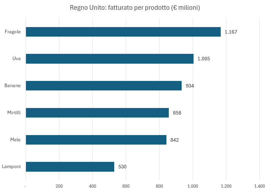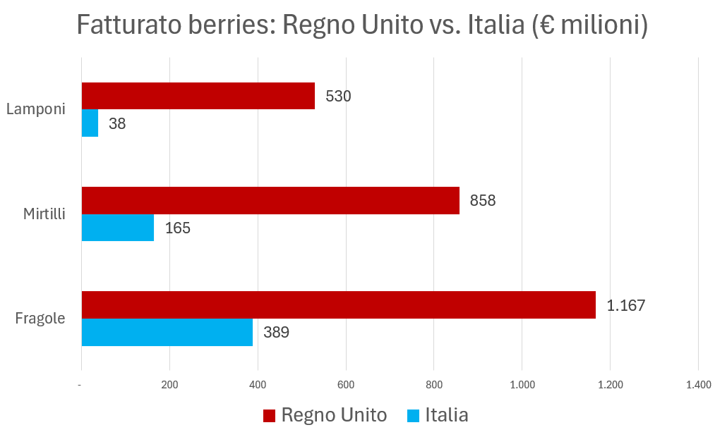 Il fatturato delle fragole nel Regno Unito è circa tre volte superiore a quello italiano, quello dei mirtilli cinque volte superiore, mentre per i lamponi il divario è ancora più marcato: nel Regno Unito si vendono quattordici volte più lamponi che in Italia.