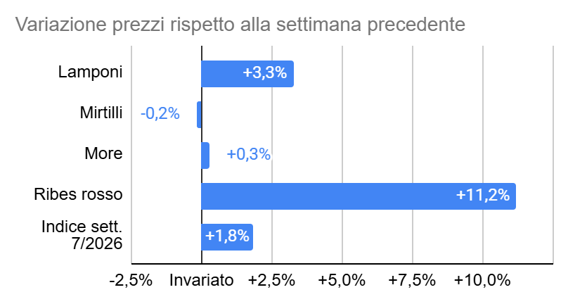 In sintesi i prezzi dei piccoli frutti nella GDO italiana nella settimana 7/2026 hanno avuto il seguente andamento rispetto alla settimana precedente: