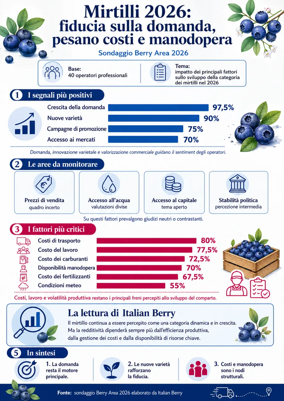 Il sentiment raccolto alla Berry Area 2026 restituisce una visione fiduciosa ma realista: gli operatori vedono nella categoria dei mirtilli un comparto ancora dinamico, sostenuto dalla domanda e dall’innovazione, ma allo stesso tempo esposto a pressioni operative che potranno incidere in modo significativo sulla redditività.